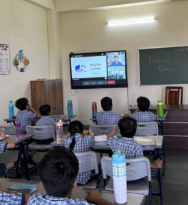 While the classes are delivered online, they are held inside the school, with children seated in well-monitored classrooms. This hybrid arrangement offers them perfect balance-the excitement of online interactivity and the comfort of a structured school environment experiencing new-age learning methods. The smartboard experience opens doors for students to interact with guest speakers in the process of learning.